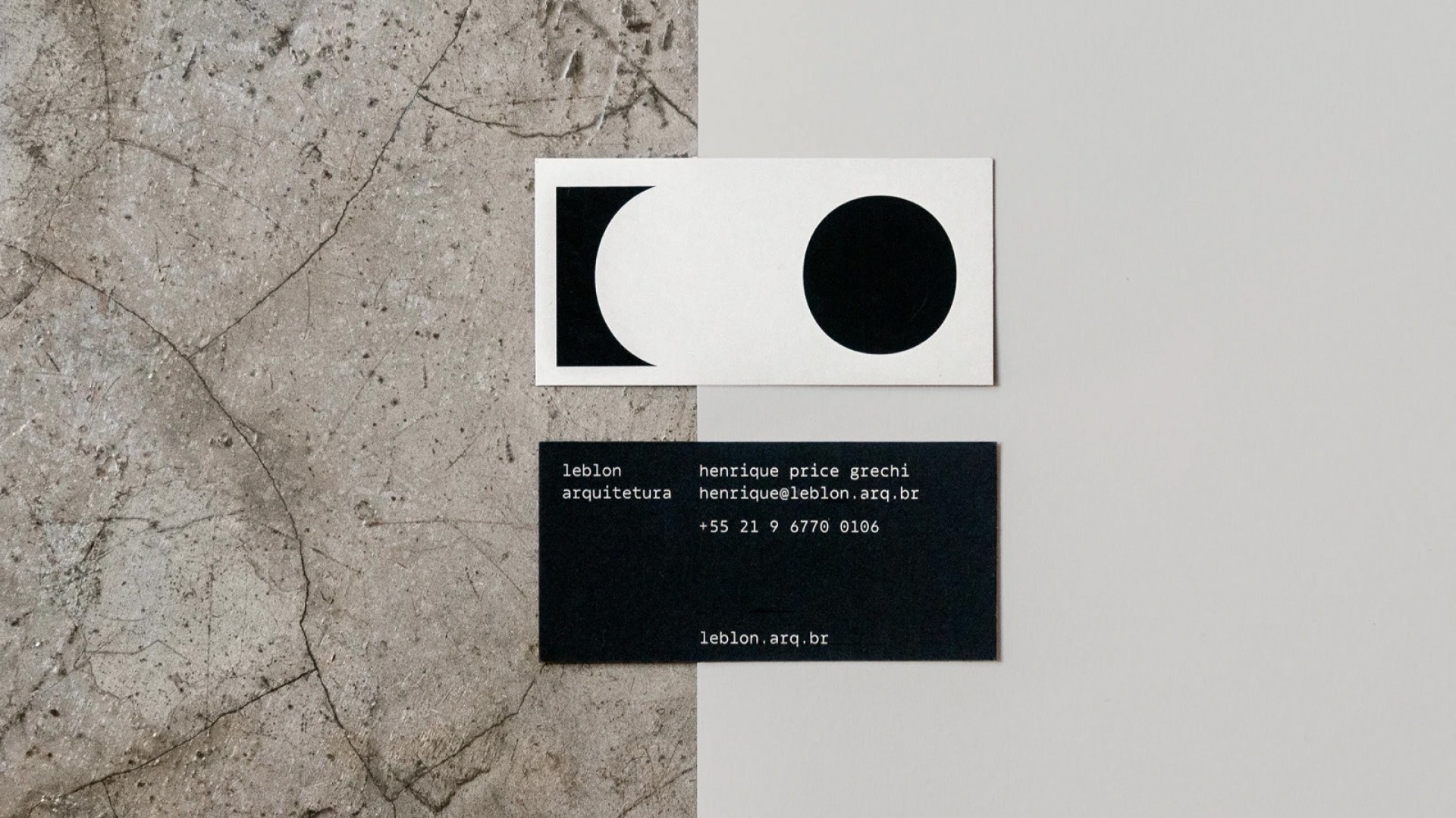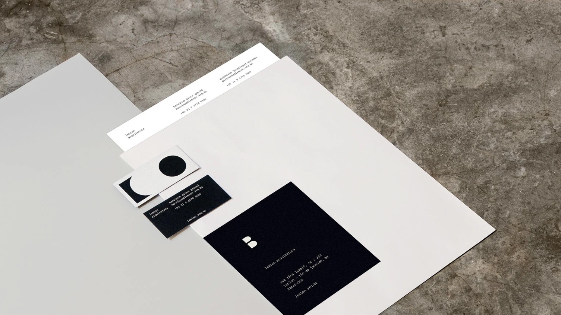 A brand identity project for Leblon Arquitetura, exploring how architectural principles such as balance, contrast, and structure could be translated into a cohesive graphic system across digital and physical applications.